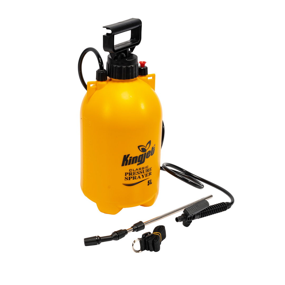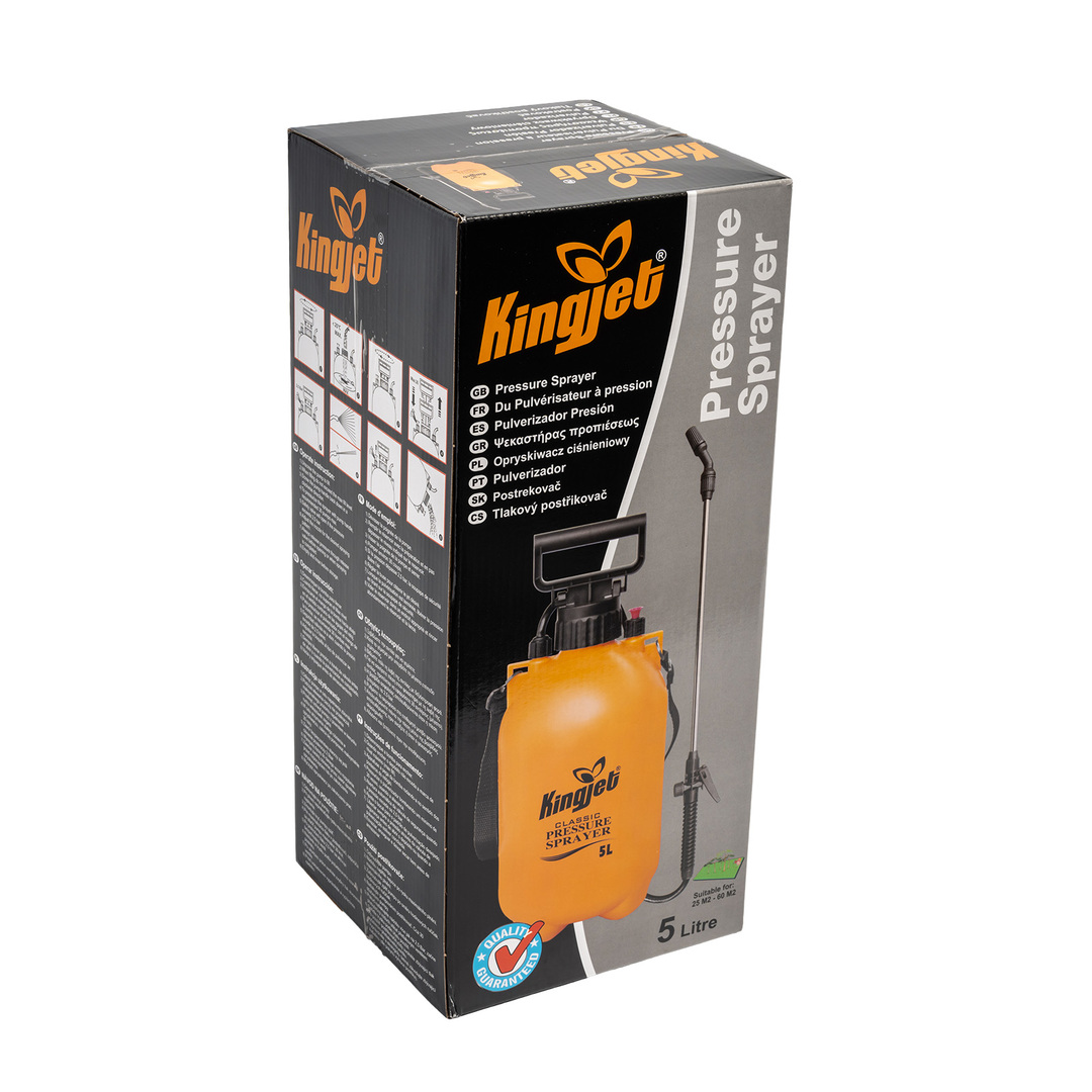 Postrekovač tlakový 5l KINGJET. Obsahuje nastaviteľnú trysku s možnosťou zaistenia stáleho postreku a tiež nerezový nástavec. Celková pracovná kapacita je 5 litrov. Tak isto sa tu nachádza bezpečnostný ventil, tlak 2,5bar.