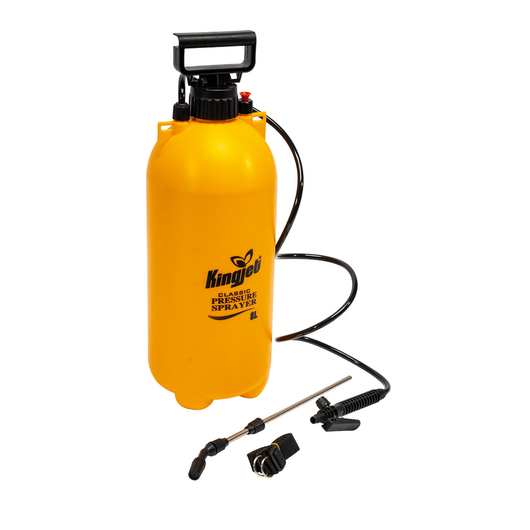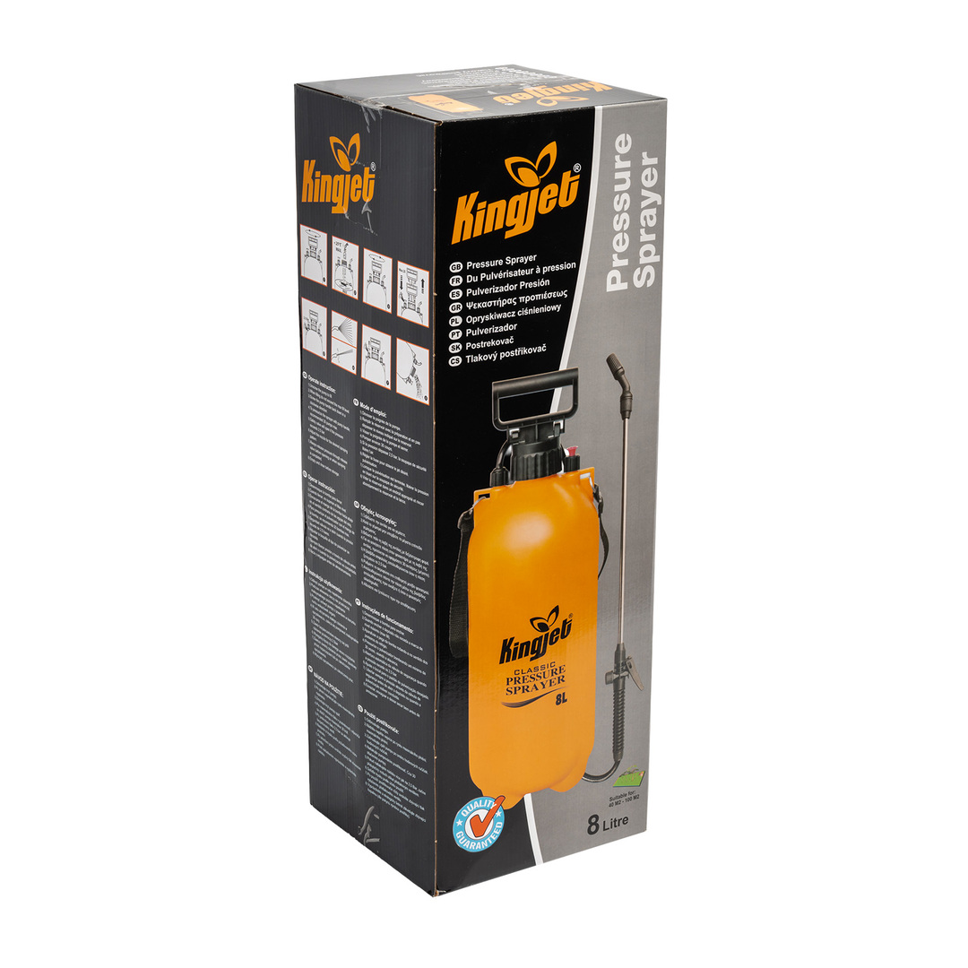 Postrekovač tlakový l KINGJET. Obsahuje nastaviteľnú trysku s možnosťou zaistenia stáleho postreku, nerezový nástavec. Celková pracovná kapacita je 8 litrov. Nachádza sa tu tak isto aj bezpečnostný ventil, tlak 2,5bar.