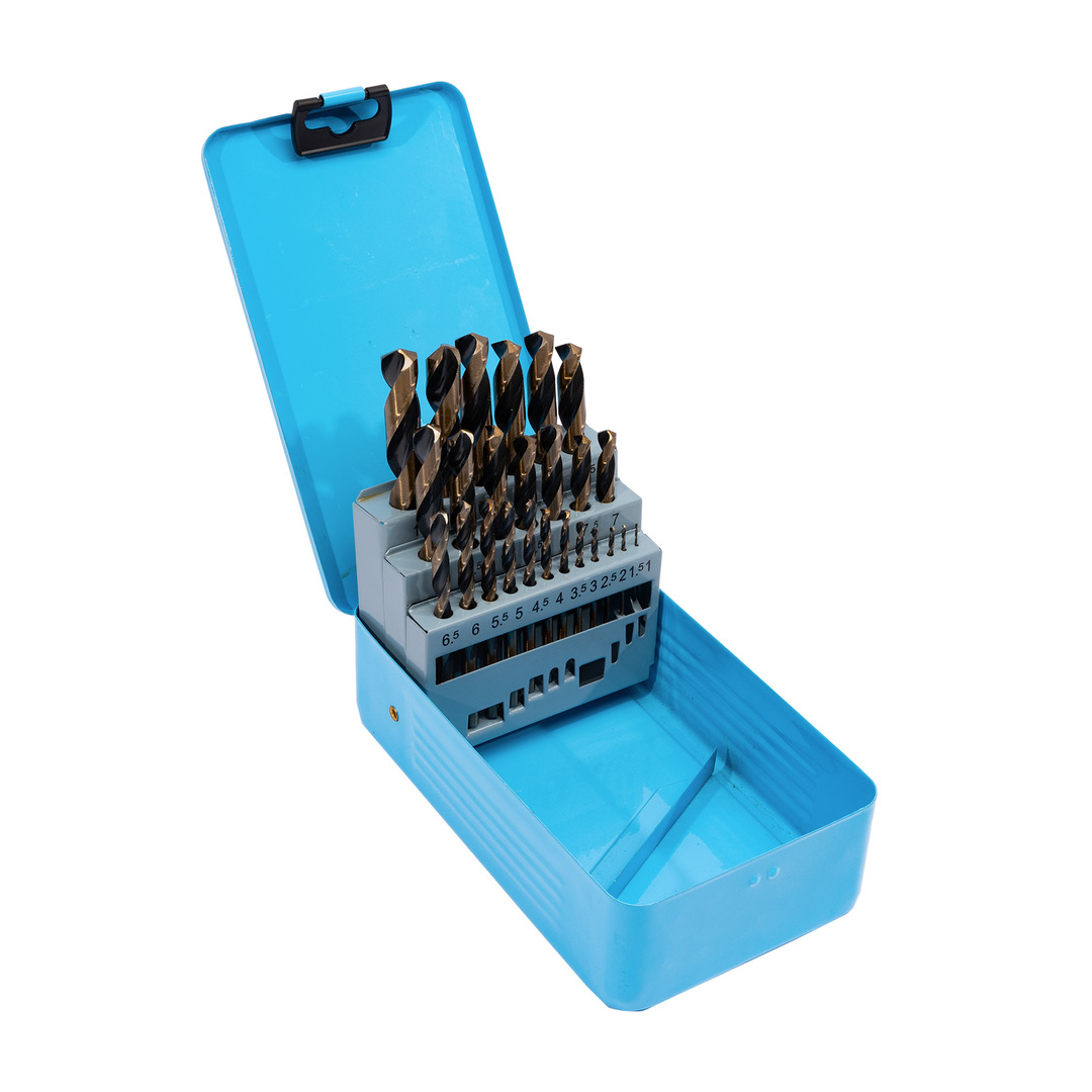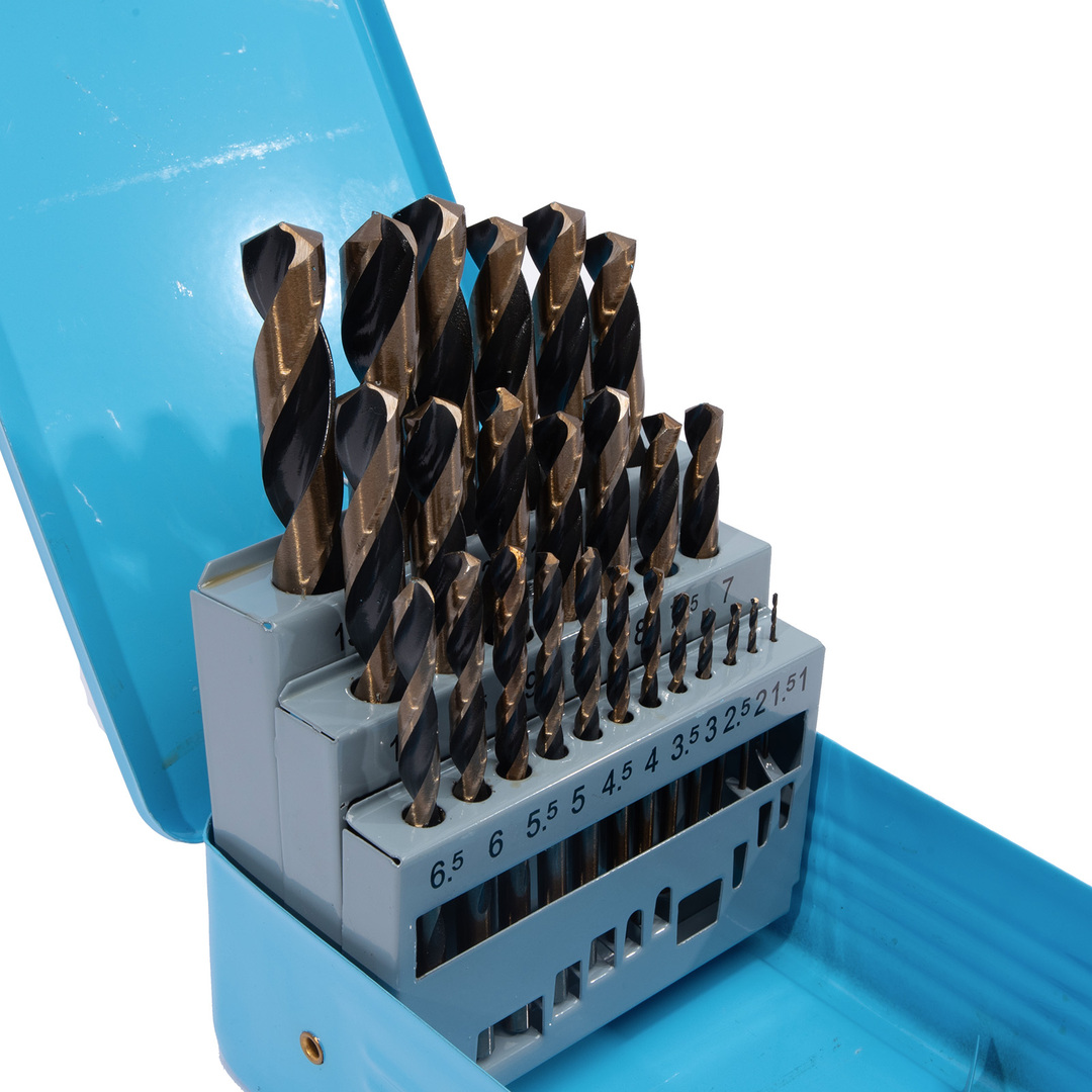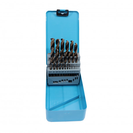 Súprava vrtákov do kovu vyrobených z HSS ocele. Vrtáky sú uložené v kovovom boxe. Je možné opätovne brúsiť.
