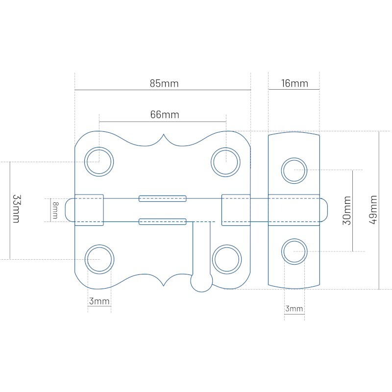 Univerzálna 85 mm dlhá závora do dverí, brán, truhlíc a podone. Jej 2 mm hrubá plechová konštrukcia zaisťuje stabilné uzamykanie. Umožňuje povrchovú alebo zapustenú inštaláciu v závislosti od miesta inštalácie.